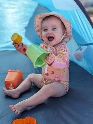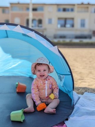 Op het strand maakten we steeds een zo veilig mogelijke constructie zodat Julie in de schaduw kon zitten en geen zand in de buurt had - want dat verdwijnt tegenwoordig meteen haar mond in. Meerdere strandlakens naast/over elkaar, een strandtentje, een parasol en heel wat speelgoed zodat ze geen interesse zou hebben in het zand. Isn't she adorable in haar strandoutfitje? ❤