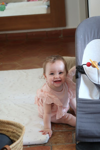 Voor Thomas en mezelf was het voornamelijk een rustvakantie, zeker nu Julie sinds kort doorslaapt 's nachts. Geen nachtshifts meer, wat een wereld van verschil. Voor Julie daarentegen leek het een trainingskamp te zijn. Ze kroop op handen en knieën het hele appartement door, ze was voortdurend op verkenning en zat geen twee minuten stil. We bakenden al snel een speelruimte af met kussens en obstakels, maar ze liet zich daardoor niet ontmoedigen. Plots kon ze zich rechttrekken aan de meubels en strekte ze haar beentjes. Al snel stond ze recht - wauw, weer iets nieuws geleerd! En dat vindt ze duidelijk heel tof. Van de spiegel was ze niet weg te slaan en ze kan tegenwoordig op haar eentje spelen. Lachgeluidjes maken, met haar armen zwieren, vrolijk gebrabbel tegen haar speelvormpjes. We vinden het heerlijk om haar bezig te zien.