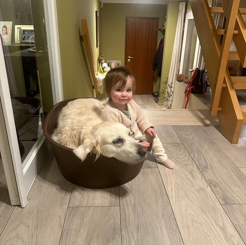 In haar ontwikkeling blijft Julie stappen vooruit zetten, zo verbaasde ze mij onlangs door met een boekje naar me toe te komen toen ik haar vroeg welk boekje ze graag samen wou lezen. Ze begint ons te begrijpen, zo leuk! En neen schudden met haar hoofdje of vingertje kon ze al, maar sinds kort wuift ze en gooit ze handkusjes bij het weggaan (met het bijhorende smakgeluid). Om helemaal van weg te smelten. En wanneer we muziek opzetten, wiegt ze mee op de muziek of draait ze met haar handjes. Woordjes uitspreken doet ze nog niet, maar ze oefent alvast de klanken. Mamama, papapa, juuu, zachjesss. Daarnaast vindt ze het heerlijk om torens te maken van speelgoed, conserven of wc-rollen. En ohja, ze blijkt een ontzettend grote fan te zijn van honden en katten. Zo houdt ze ervan om heel dicht tegen Luna aan te zitten.